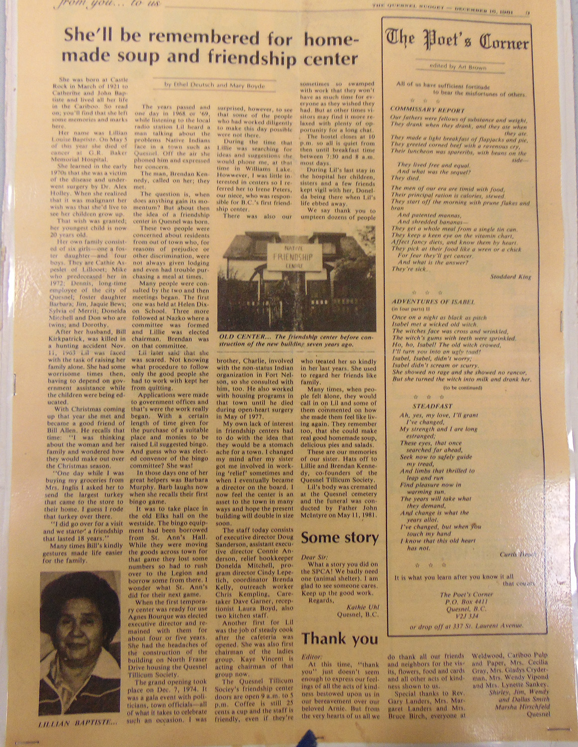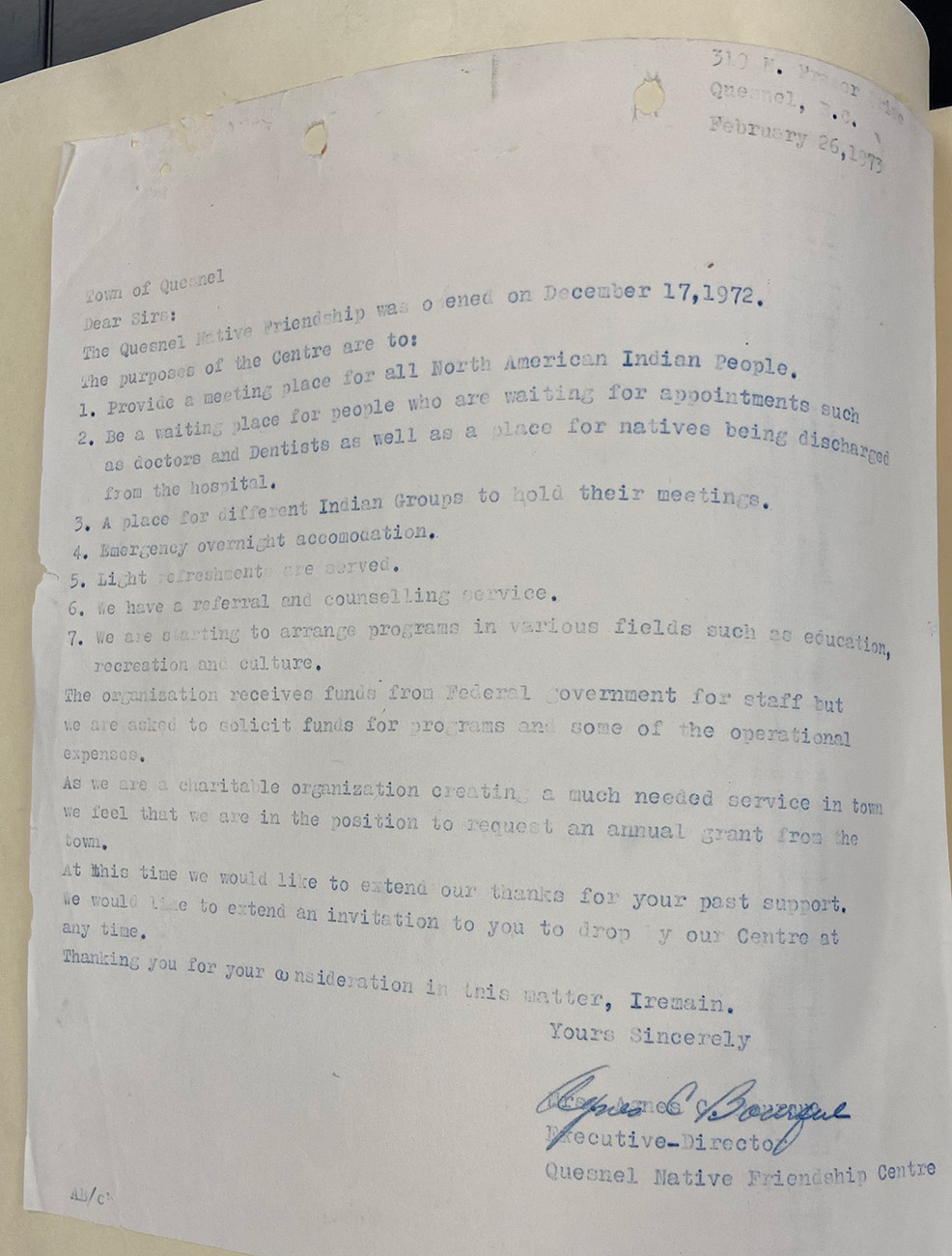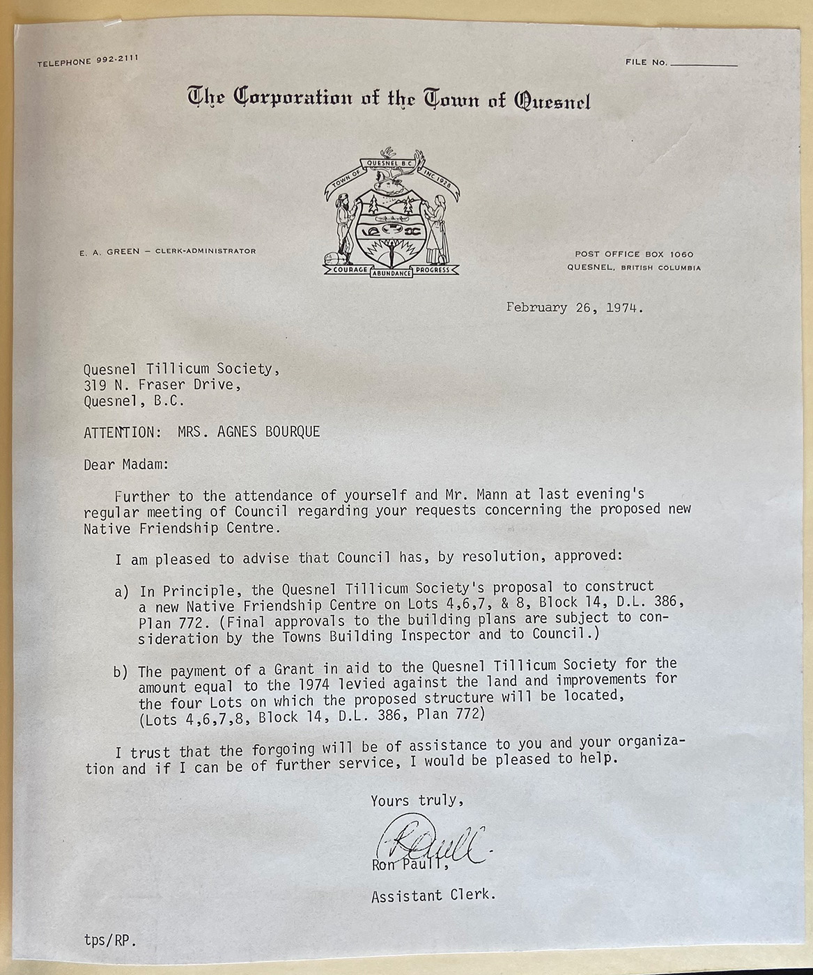 The Quesnel Tillicum Society has kept numerous correspondences, certificates, press clippings and more of our history. Visit The Friendship Centre to see more in person!